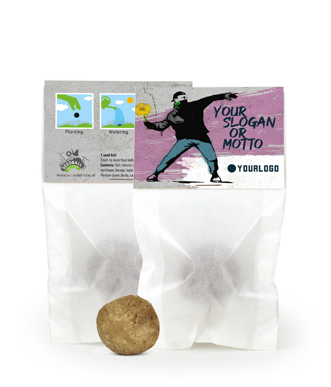 Our handmade Seed Balls (also known as Seed Bombs) are made from a sustainable seed mix, peat-free soil and natural clay. The rock-hard balls can be tossed over walls and obstacles onto brownfields, industrial sites and other gray places.